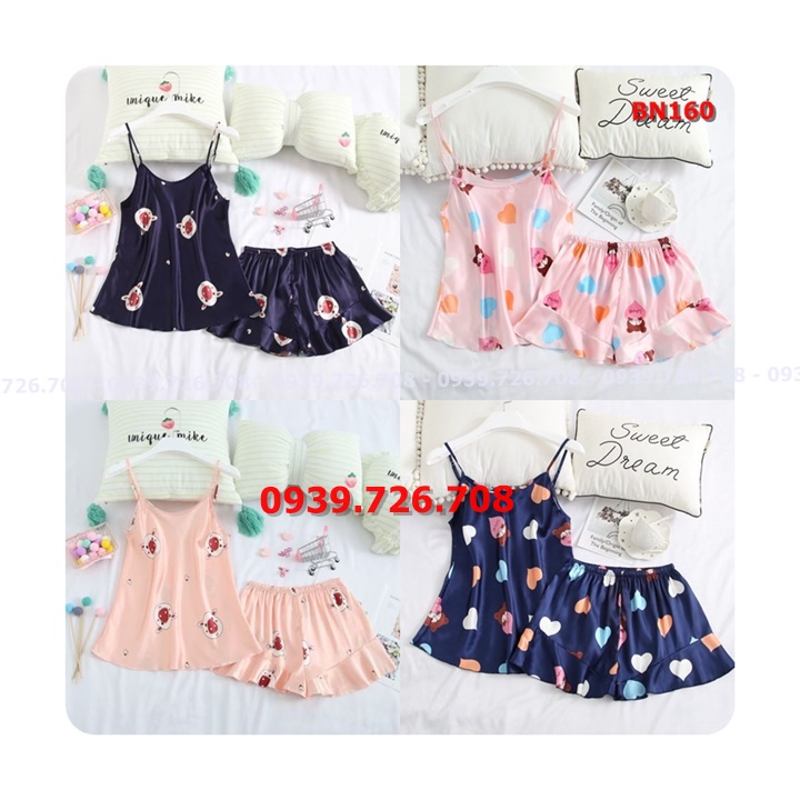 --- >Bộ ngủ lụa quần đùi 2 dây thoáng mát may từ chất liệu phi lụa mặc lên mịn, mát, ko nhăn nhúm, nhẹ như chính làn da của bạn, Kiểu dáng áo 2 dây, quần đùi sexy, họa tiết dễ thương ngọt ngào. Bộ ngủ nữ lụa thoáng mát, quyến rũ.. Khiến chị em mặc cực kỳ dễ chịu,