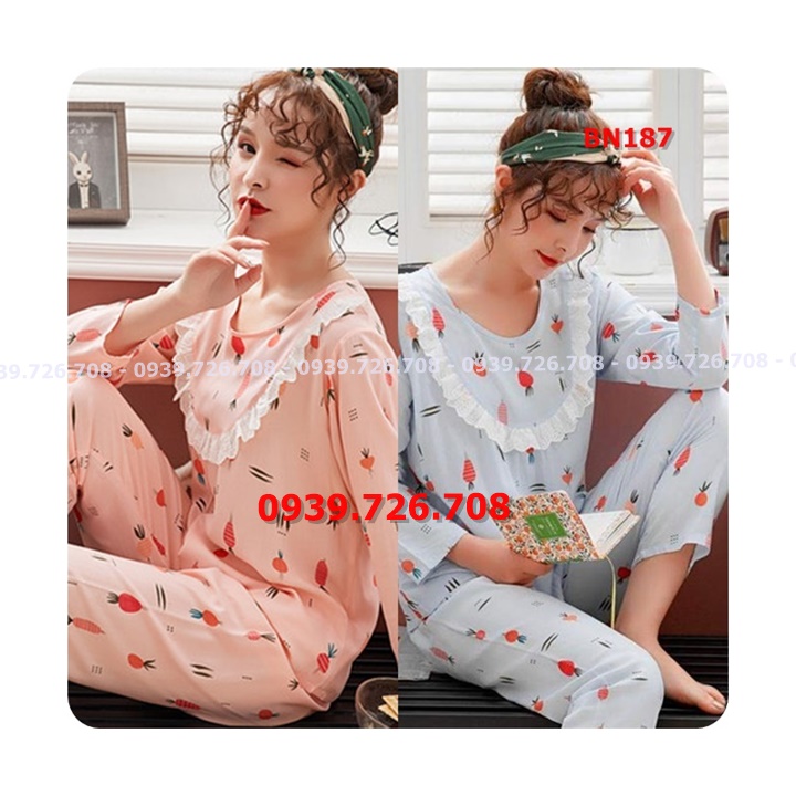 Bộ ngủ cotton lụa quần dài tay dài có bèo chất mịn mát