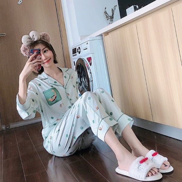 Bộ ngủ pijama lụa cao cấp quần dài tay dài chấm bi phối túi áo